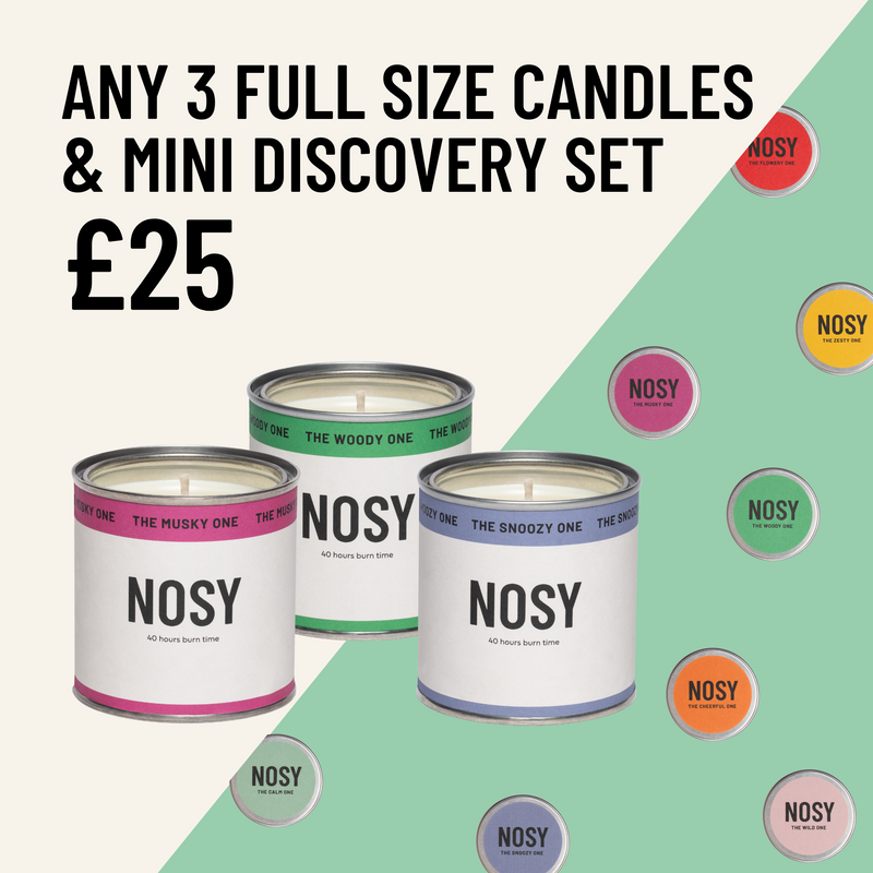 Pick 3 candles and the Mini Discovery Set from this page, and the bundle price will be automatically applied. Sorted.